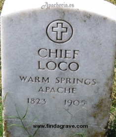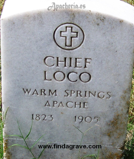 llamaban los mexicanos. Los estadounidenses les denominaban Warm Springs. (Tenía una frágil salud y cuando el 1 de enero murió de tuberculosis, Ruth Loco, su nieta de cuatro años, su ánimo empeoró. En el “Registro de la Historia Médica de Fort Sill, 1903-1913”, se lee: “El 2 de febrero de 1905, murió Loco, a la edad de 82 años, por causas desconocidas”. Está enterrado en el Cementerio Apache de Beef Creek, [Lawton, Comanche County, Oklahoma] donde también están enterradas sus tres esposas Chiz-pah-odlee en 1895; Chhish-odl-netln y Clee-hn en 1909).
