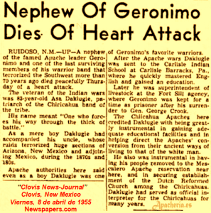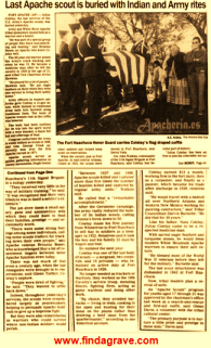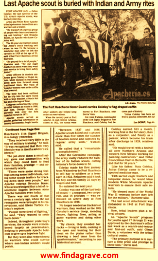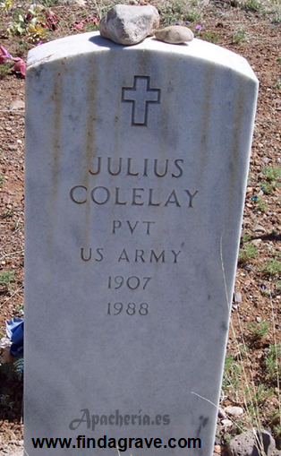 Colelay. (Había nacido el 4 de julio de 1907. Se hizo explorador del Ejército a los 15 años, desde 1923 a 1929. Fue enterrado en el Fort Apache Cemetery [Navajo County, Arizona] con la presencia de oficiales del Ejército y apaches vestidos con ropas tradicionales. Colelay fue saludado por una salva de 21 disparos.