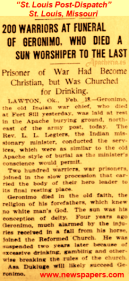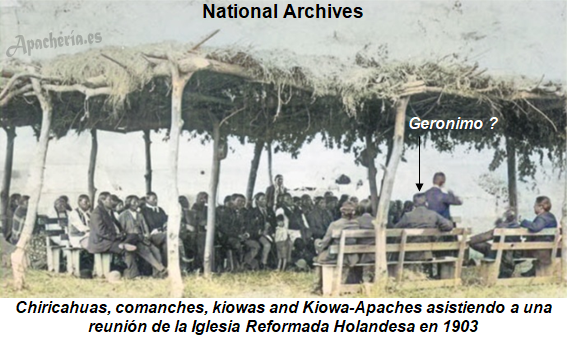 Gerónimo a asistir a un servicio religioso. (Él seguía la religión de Usen pero acudió. Después de un sermón sobre la penitencia, Gerónimo declaró: “El camino de Jesús es mejor y quisiera que mi gente lo siguiera. Ahora empezamos a pensar que los cristianos blancos nos quieren”. A lo largo de su vida, Gerónimo se movió frecuentemente por impulsos, y para un cambio tan repentino en sus creencias, parece que eso fue lo que ocurrió. Durante un año intentó tomar una decisión, aferrarse a las viejas creencias o abrazar el cristianismo. En 1903, cojeando de una caída de su caballo, llegó a la iglesia para escuchar un sermón sobre Jesús. Gerónimo pidió a los pastores que le dieran un nuevo corazón. Le bautizaron en la Iglesia Reformada Holandesa.
