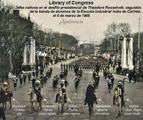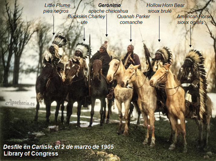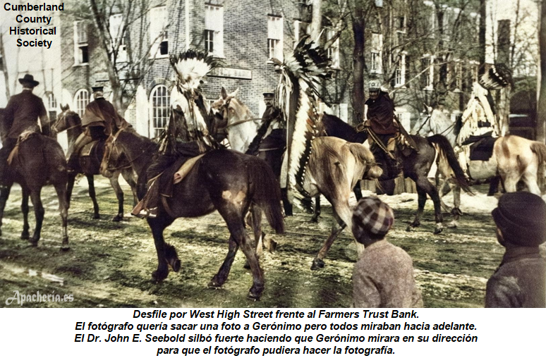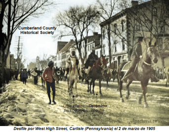 * El 2 de marzo de 1905, Gerónimo desfila por las calles de Carlisle ([Cumberland