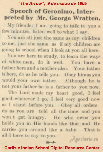 “Gerónimo se ha ganado realmente las simpatías tanto de blancos como de indios. Excepto una o dos veces que no se encontraba bien, siempre ha estado amable, atento y cortés. Nunca hubiera pensado que podría llegar a hablar tan favorablemente de aquel viejo sujeto a quien consideraba el propio diablo en persona. Me complace devolvérselo en tan buen estado de salud como cuando usted lo trajo aquí”.