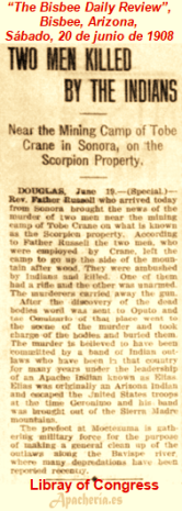 * En abril de 1901, unos apaches atacan a unos mineros a 136 km al oeste de Casas Grandes ([Chihuahua]. Un informe del 24 de mayo decía que se habían detectado la presencia de apaches provenientes de Sonora).