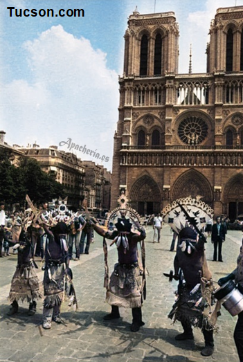 * El 6 de julio de 1977, un grupo de bailarines apaches procedentes de la Reserva White Mountain, danzan frente a la Catedral de Notre Dame de París.
