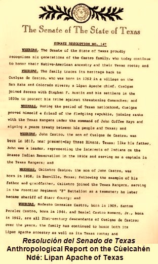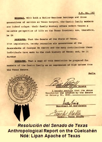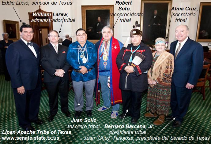 reconoce la contribución hecha por los “descendientes vivos” de la Lipan Apache Band of Texas. (Daniel Castro Romero Jr., el presidente del Consejo General de la Lipan Apache Band of Texas, ha sido responsable de las necesidades sociales y económicas de 1.200 miembros de la tribu a nivel nacional).