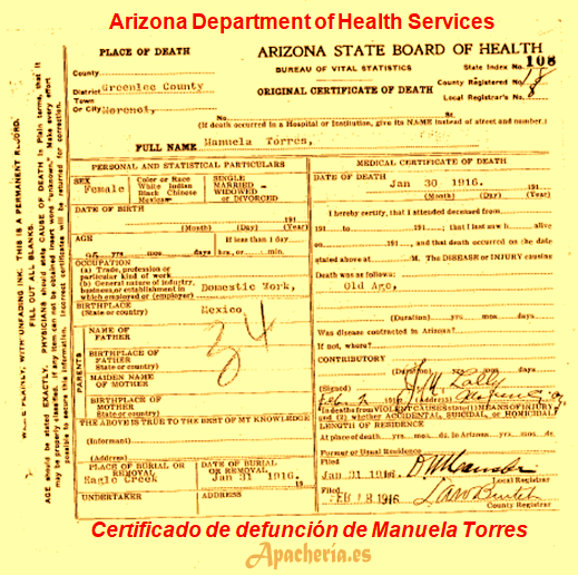 Después de haber formado una gran familia en Chihuahua, Manuela Torres regresó cuando tenía 90 años al lugar donde nació, cerca de Silver City [Grant County, New Mexico]. Falleció cuando tenía más de 100 años en Morenci [Greenlee County, Arizona]).
