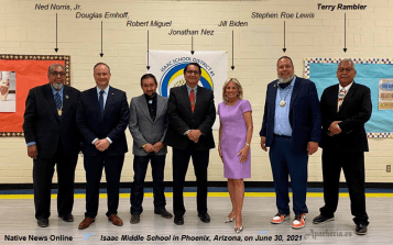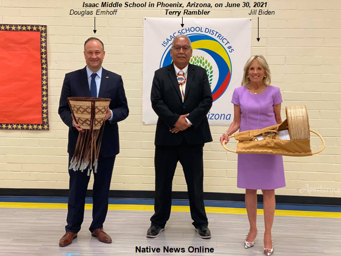 Joe Biden; y Douglas Emhoff, esposo de la vicepresidenta Kamala Harris, visitaron la “Isaac Middle School” en Phoenix (Arizona) para intentar aumentar la vacunación del Covid-19 en todo Arizona, incluidas las comunidades tribales. (Con ellos se reunieron varios líderes tribales de Arizona: Ned Norris, Jr., Chairman of the Tohono O’odham Nation; Robert Miguel,