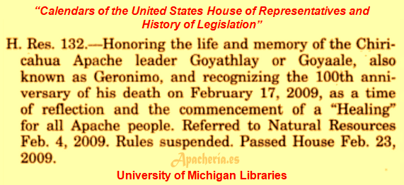 la resolución n.º 132 de la Cámara, honrando la vida y la memoria del líder apache chiricahua Gerónimo. (La delegada por la isla de Guam [territorio no incorporado del Pacífico occidental], Madeleine Bordallo plantea la resolución: “Homenaje al líder apache Goyathlay”. “Sr. presidente, propongo suspender las normas y estoy de acuerdo con la resolución [H. Res. 132] honrando la vida y la memoria del líder apache Goyathlay o Goyaalé, también conocido como Geronimo, y reconocer el 100º aniversario de su muerte, el 17 de febrero de 2009, como un tiempo de reflexión y el comienzo del ‘reconocimiento’ para todos los apaches”. El secretario leyó el título de la resolución. El texto de la resolución es el siguiente: