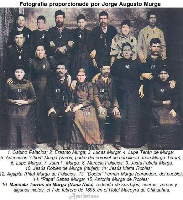 La historia de la familia comienza en algún momento de la primera mitad del siglo XIX con Juan Murga, conocido como “Juan El Duro”, un boticario de la zona de San Andrés, y de Nana Nela, hija de un jefe apache [la familia manifiesta que la muchacha era pariente consanguíneo de Gerónimo, pudiendo ser una hermana. La única hermana conocida de Gerónimo fue Nah-dos-te, esposa de Nana. Los apaches llamaban hermanos a quienes en realidad eran primos, como por ejemplo una prima carnal de Gerónimo llamada Ish-keh, más conocida como Ishton, hija de uno de los hijos o hijas de Mahko, se casó con Juh].