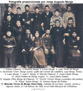 llamado Riva Palacio, Chihuahua), alrededor de 250 descendientes de Juan Murga y Manuela Torres, en un paraje que forma parte de los terrenos que fueran originalmente de este matrimonio y que hoy son propiedad de Gregorio Murga: el Rancho Lucas; según informa el periódico de Chihuahua “El Diario”, el martes 14 de agosto de 2001. (El periódico “El Heraldo de Chihuahua” publicó el domingo 5 de agosto de 2001, la historia de la familia. La fotografía data del 7 de febrero de 1895, cuando la familia Murga se reunió en el Hotel Maceyra de Chihuahua. Jorge Augusto Murga, un descendiente actual, añade más datos a esta página.